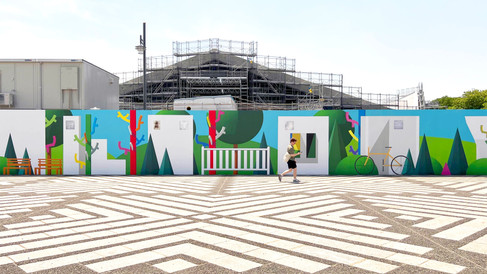 At Komazawa Olympic Park, I created the large-scale outdoor work Symbiotic Landscape on a temporary construction wall. Taking the renovation of the gymnasium and the park environment as a point of departure, the piece combines my recurring motif “color trees” with the theme colors of the Tokyo Deaflympics to form a landscape where urban activity and nature coexist. Within everyday movements—passing through and staying—perception of the public space is gently renewed. The temporary wall is approached not as a boundary, but as a shared landscape.